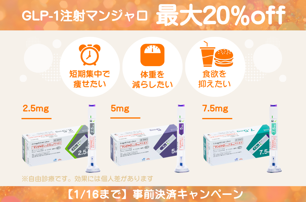 好評の声にお応えし、人気のGLP-1注射「マンジャロ®」をお得にご利用いただけるキャンペーン復活! 事前決済でご購入された方限定で、2025/12/29から2026/01/16まで最大20%オフの特別価格に。 年末年始のダイエットにぜひご活用ください。