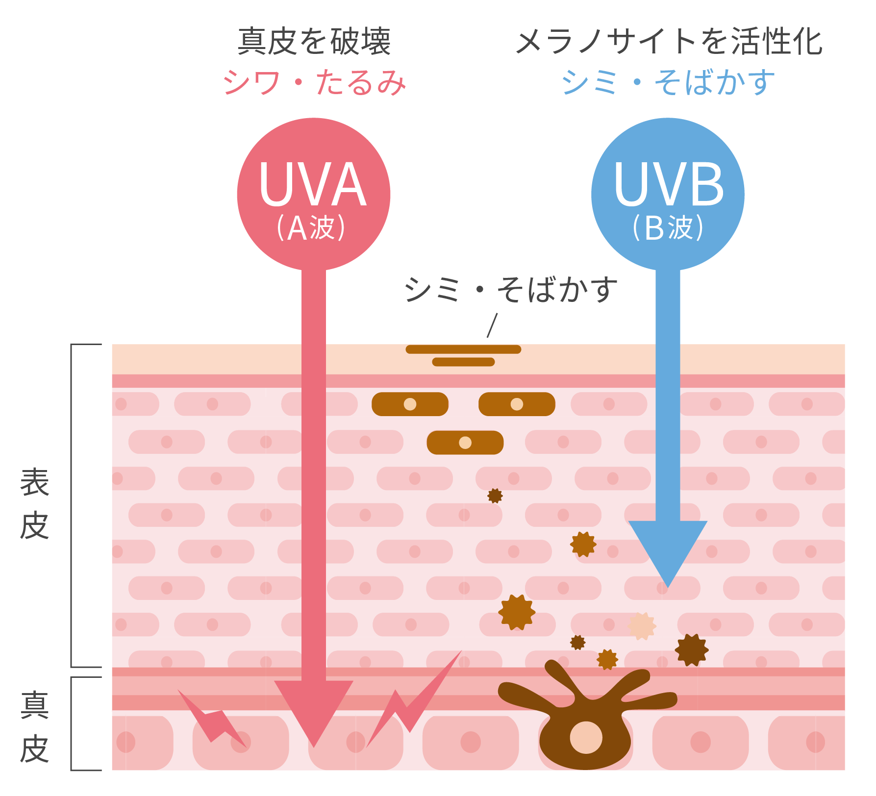 紫外線には主に UVA(A波) と UVB(B波) の2種類があり、それぞれ肌に異なる影響を与えます。