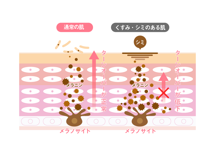 くすみの原因はさまざまで、乾燥・血行不良・メラニンの蓄積・ターンオーバーの乱れによる古い角質の停滞などが複合的に関係しています。
