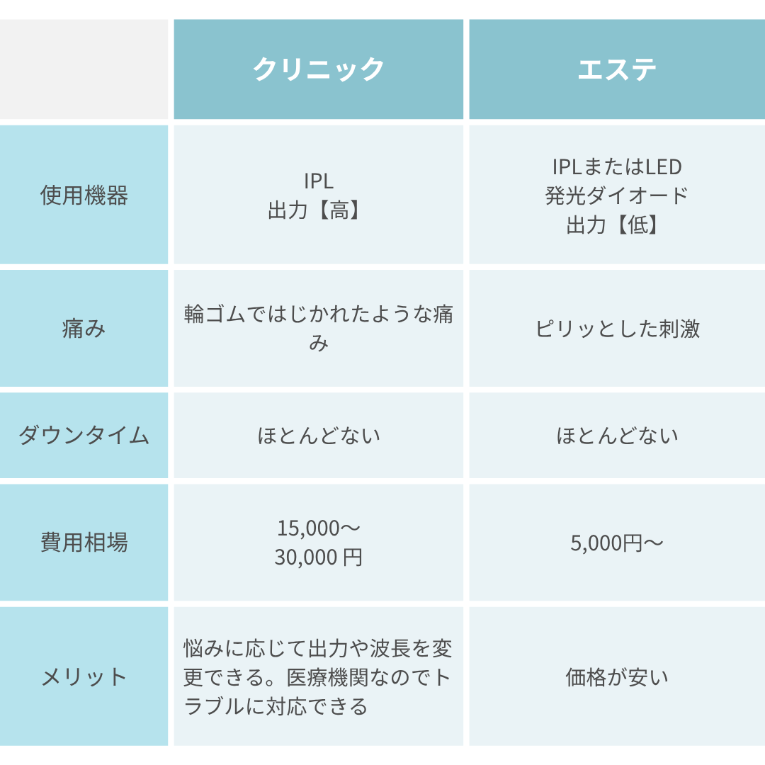 また、クリニックは医師が常駐する医療機関のため、万が一肌トラブルが起きた場合でも適切な治療や処方が可能です。 一方で、エステでは医療的な対応ができないため、その点には十分注意しましょう。