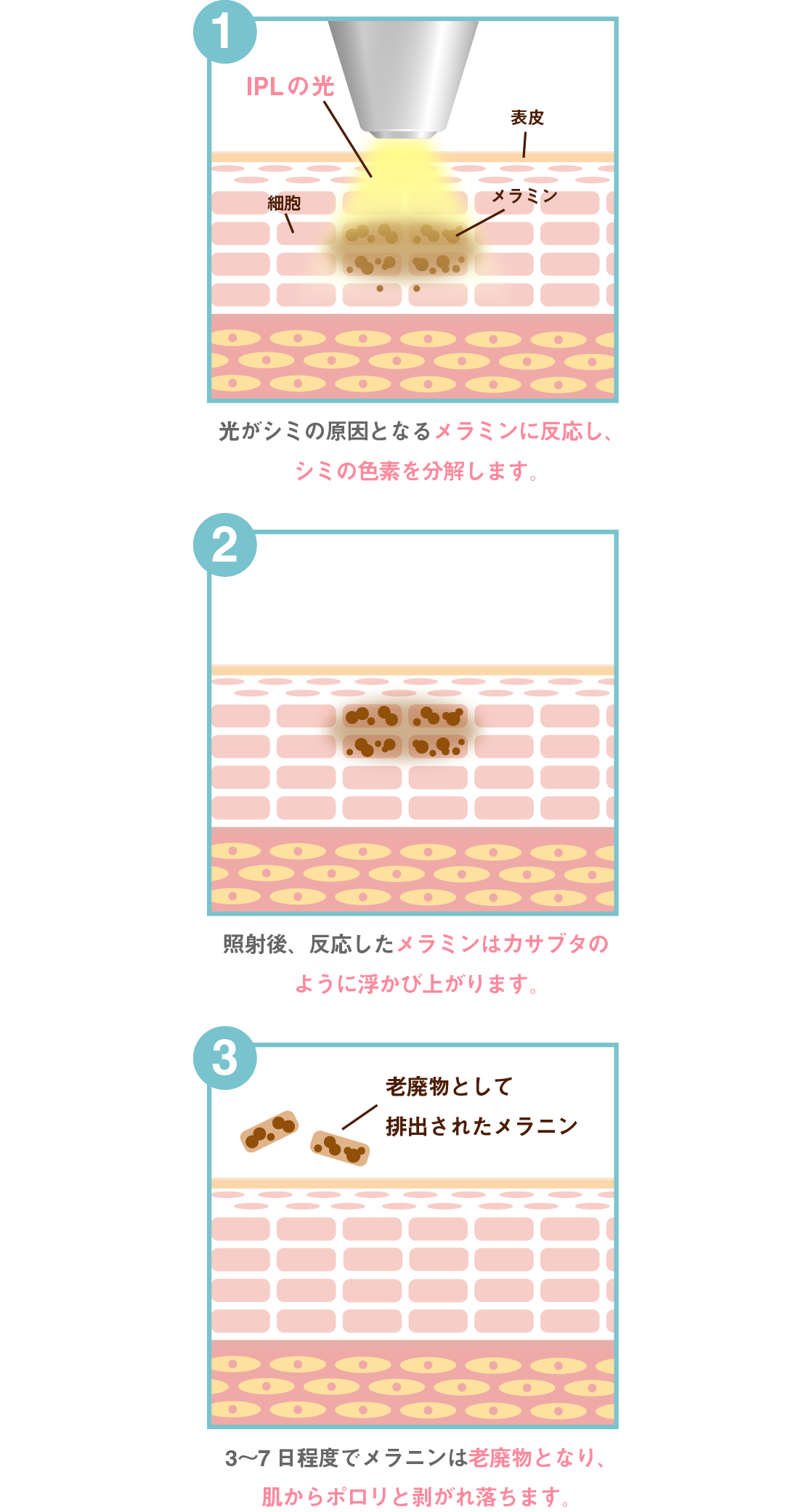 IPLの光エネルギーがメラニン色素に反応し、色素を分解・排出へと導くことで、顔全体のシミやそばかすを少しずつ薄くしていきます。