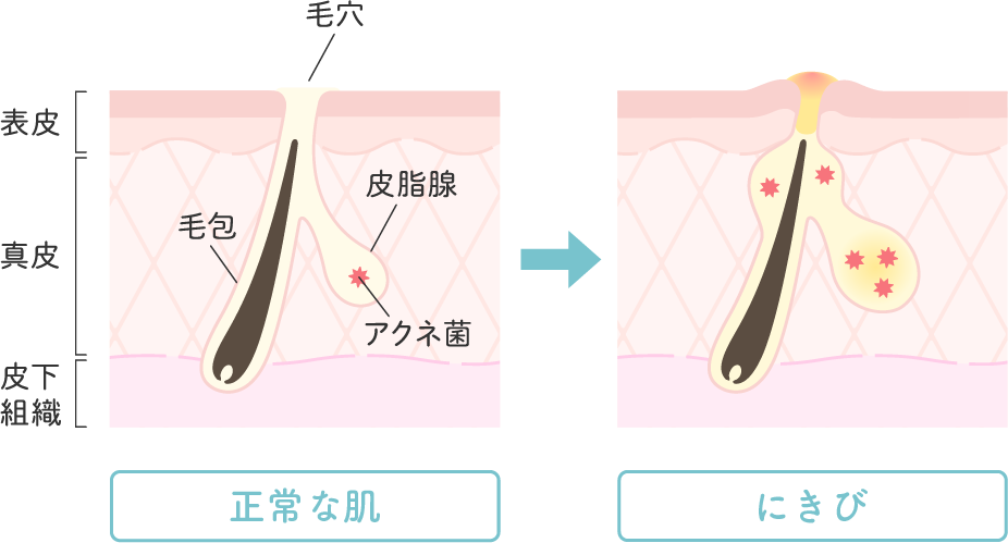 ニキビの最初のきっかけは、皮脂の過剰分泌と毛穴の詰まりです。