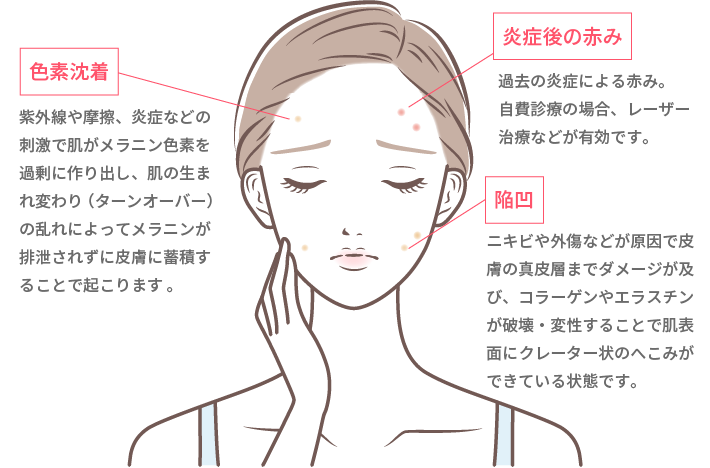 炎症が治まった後の赤みや色素沈着、クレーター状のニキビ跡は、医学的には「病気の治療」ではなく「整容(美容)目的」と判断されるため、保険は適用されません。