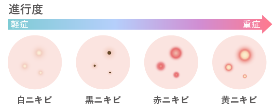 ニキビは、できたばかりの軽い状態から、炎症を起こした重い状態までいくつかの段階があります。