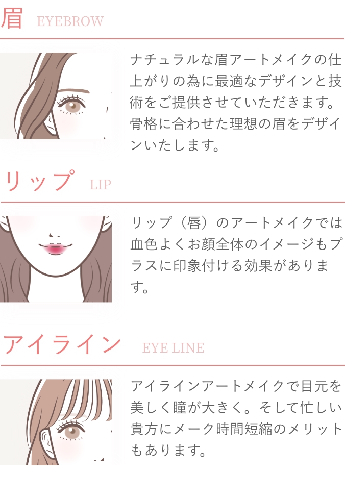 アートメイクで自分に自信を! 素顔に自信がない方、毎日のメイクでストレスが蓄積されてる方……。 そんな皆さんの力に少しでもなれたらと思っています。 メイクの時間が苦痛から楽しい気持ちになるように、 毎日を自信を持って送れるようにお手伝いさせていただきます。 アートメイクで綺麗な自分を手に入れましょう。